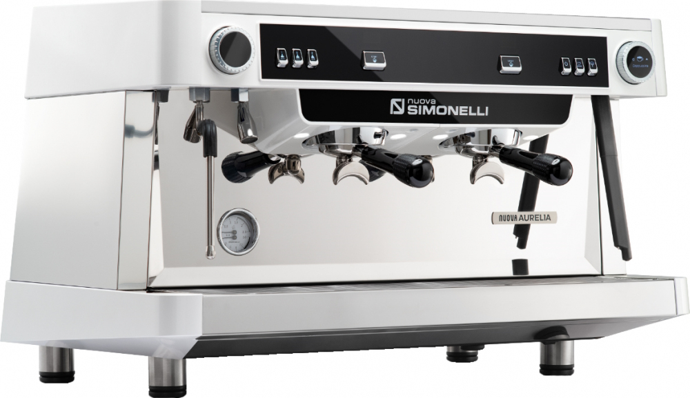 Рожковая полуавтоматическая кофемашина NUOVA SIMONELLI NUOVA SIMONELLI NUOVA AURELIA 2GR S с подключением к водопроводу предназначена для приготовления кофе эспрессо и капучино. Оснащена двумя высокими группами, экономайзером, краном для подачи горячей воды, двумя необжигающими паровыми кранами E-Steam и LED-подсветкой рабочей поверхности. Корпус изготовлен из нержавеющей стали с вставками из ABS-пластика белого цвета.