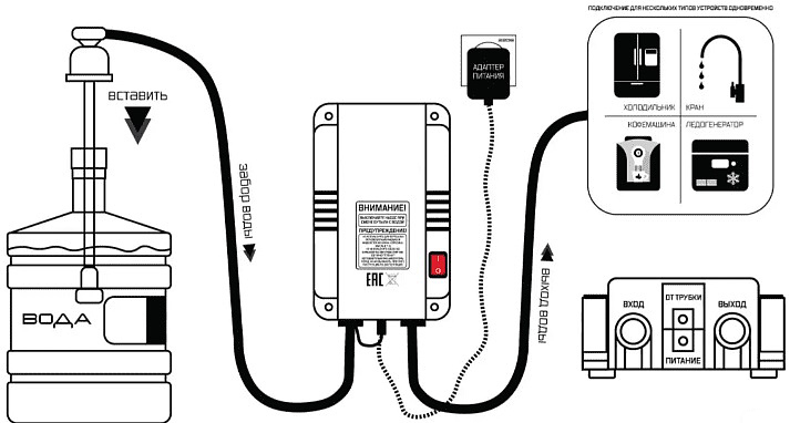 - Датчик объёма автоматически выключает насос, если бутыль опустела